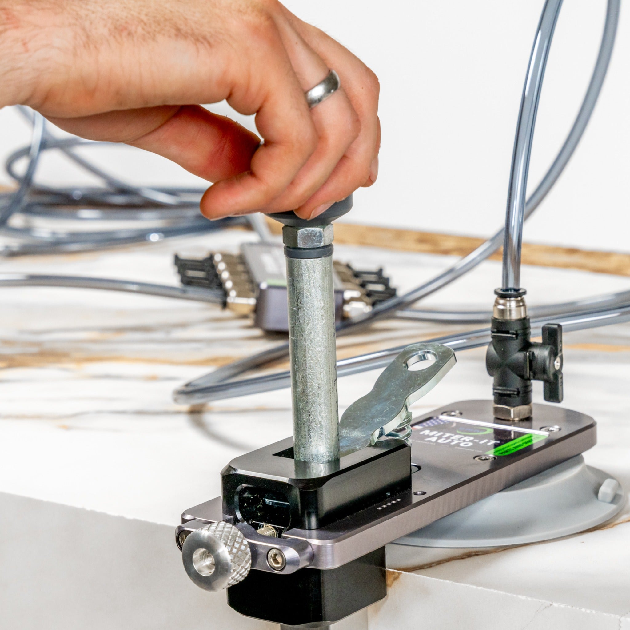 The Miter-It™ Auto is a vacuum-powered system for laminating mitered edges. It saves time and money by eliminating theneed for a helper—wherever you would need a hand to hold the material, put a Miter-It™ Auto clamp there instead!