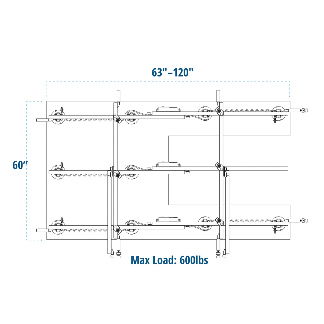 WHAT'S INCLUDED: Three adjustable rails, two 5' rigid cross-brace rails, two 3' rigid cross-brace rails, kickstand Kit, twelve 6" vacuum cups with covers, four regular handles, four handles with leveler legs, six rigid clamps with carrying case, and the auto version features three VMP750 rechargeable vacuum pumps.