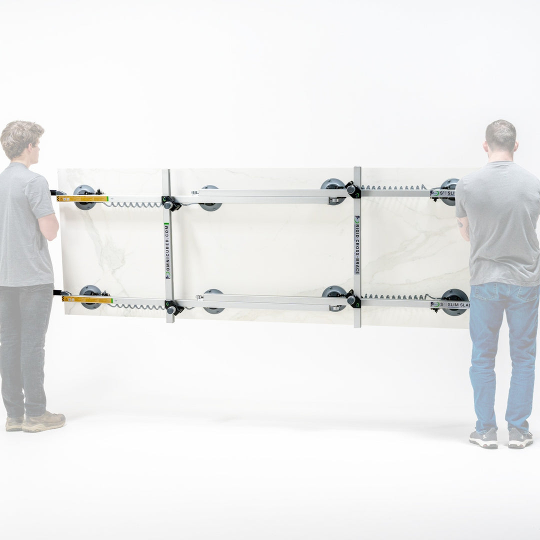 WHAT'S INCLUDED: Two adjustable rails, two 3' rigid cross-brace rails, eight 6" vacuum cups with covers, two regular handles, two handles with leveler legs, four rigid clamps with carrying case, and the auto version features two VMP750 rechargeable vacuum pumps.