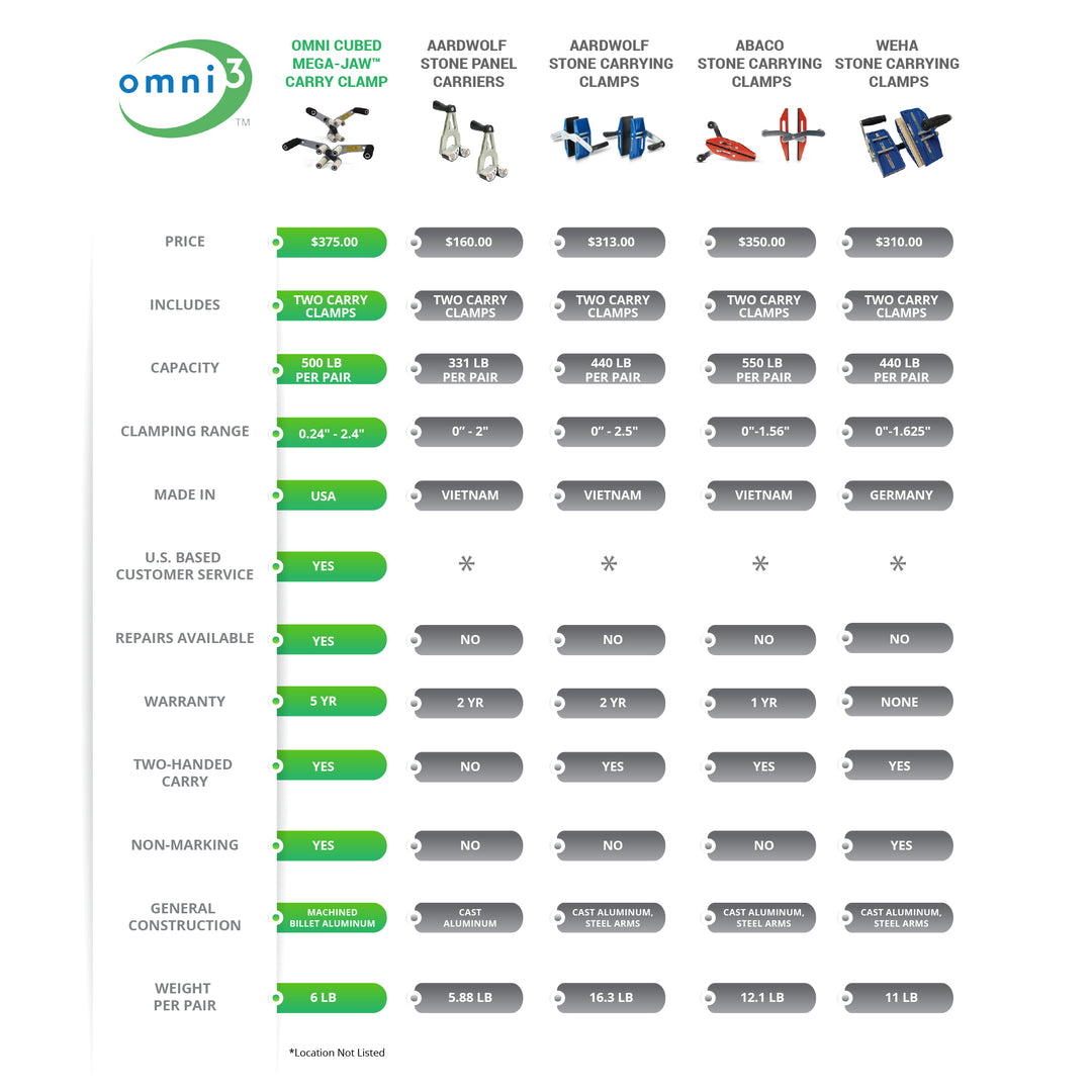 To help you see how the Mega-Jaw™ Carry Clamp stacks up against similar clamps in the industry, we've prepared a comparison chart.